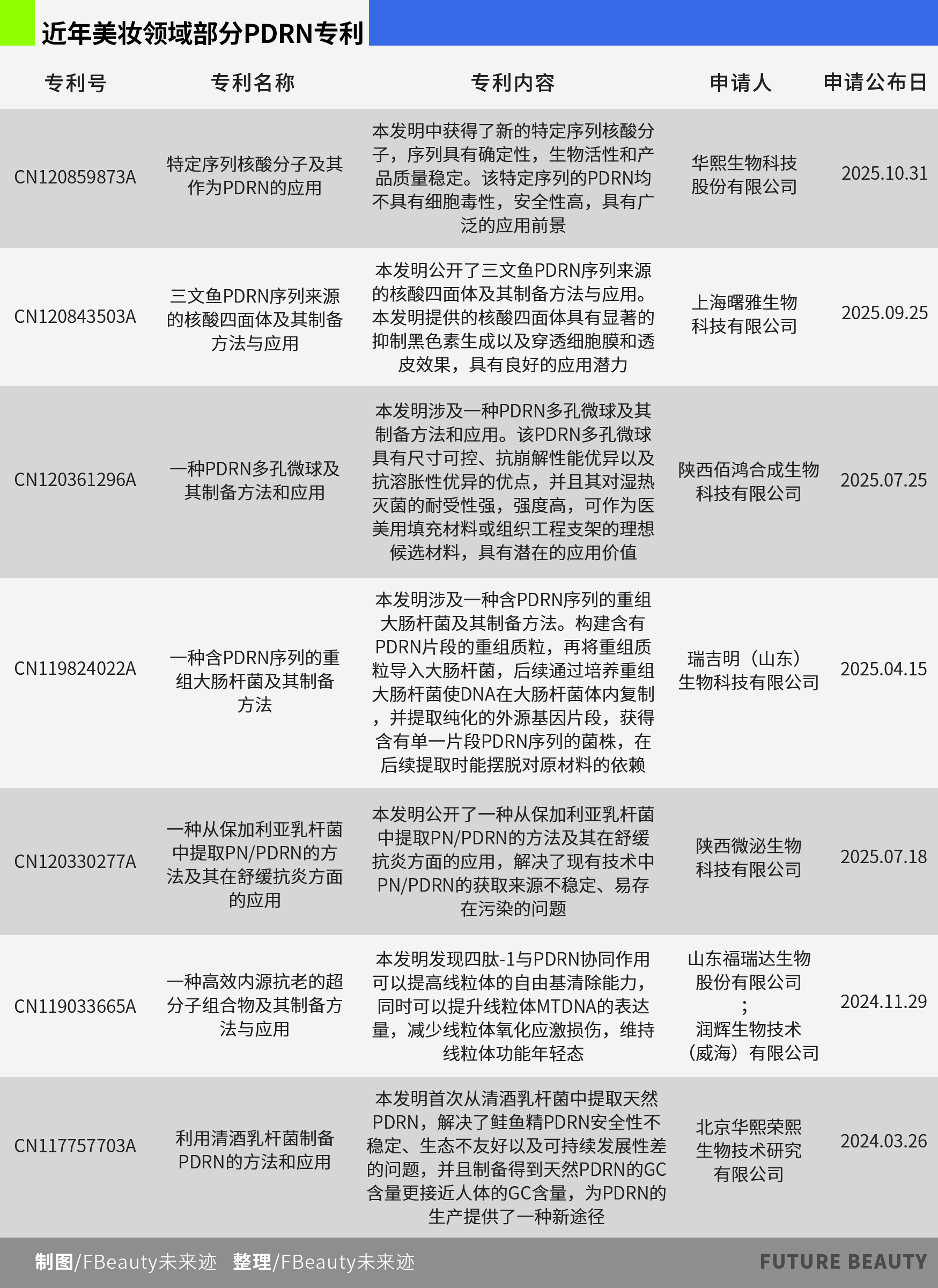 例如,不久前,国家知识产权局公布了华熙生物申请的《特定序列核酸分子及其作为PDRN的应用》专利。在成分制备工艺层面,华熙生物开发了一种具有特定序列PDRN合成方法,可解决天然风险来源PDRN可能携带病原体的风险,并解决了不同批次间质量差异问题。